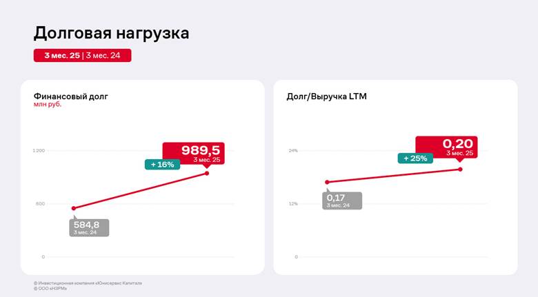 По мере роста бизнеса эмитент продолжает увеличивать долговую нагрузку. Основной источник финансирования деятельности — заёмные средства. Финансовый долг на 31.03.2025 г. составил 989,5 млн рублей, увеличившись по сравнению с уровнем прошлого года на 16%. В частности, в портфеле эмитента есть инвестиционный кредит от Фонда развития промышленности, средства которого были использованы для запуска нового цеха и реализации проекта «Производство комплектов профиля для модульных зданий».